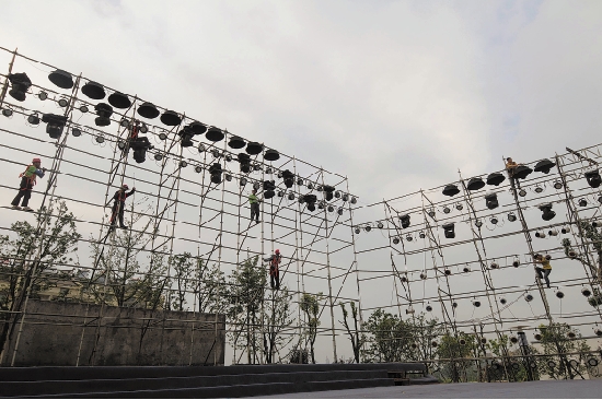 工人们正在贺村镇村歌广场搭建决赛主舞台。 黄水福 摄