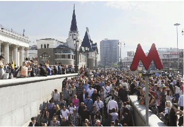莫斯科紧急情况局说,6月5日,莫斯科地铁“索科利尼基”线(1号线)的“猎人商场”站与“列宁图书馆”站之间的供电电缆突然起火,导致部分地铁线路瘫痪,约4500名乘客被紧急疏散,另有15人受伤。图为人们在一处地铁站外等待地铁恢复运营。 新华社发 |