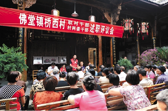6月6日,在义乌市佛堂镇桥西村,近千名村民参加“百姓考镇官”活动,两名联系该村的镇干部接受群众民主考评。联村干部向村民述职,村民对联村干部的德、能、勤、绩、廉打分。图为联村干部向村民述职。