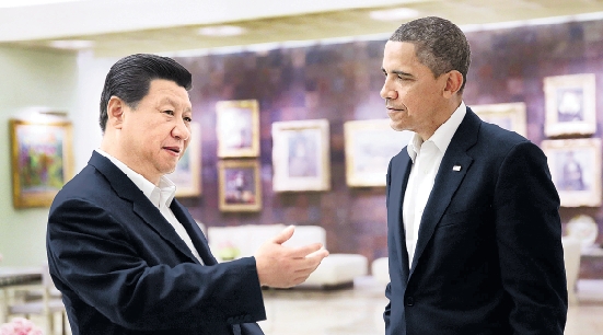 6月7日,中美元首会晤后,习近平与奥巴马交谈。 新华社记者 兰红光 摄
