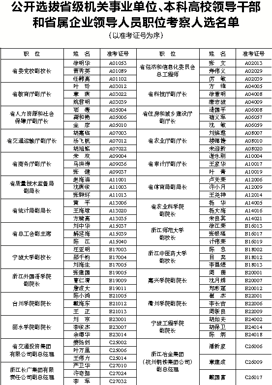| 省质量技术监督局 副局长 | 赵海滨 | A11001 | 省体育局副局长 | 卢关荣 | A12006 |