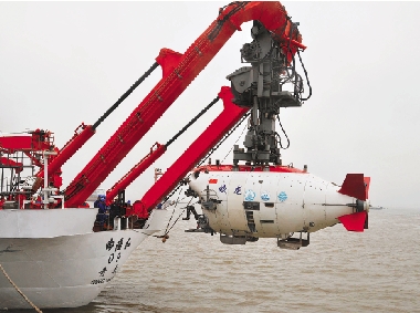6月9日,“蛟龙号”今年首个实验性应用航次在江苏江阴的苏南码头开展了首次集结演练。“向阳红09”船将于10日搭载中国载人深潜器“蛟龙”号从江苏江阴起航,奔赴南海和北太平洋执行首个试验性应用航次。这次“蛟龙”号下潜的主要目的不再追求深度的突破,而是服务于科考项目,而且将首次搭载科学家下潜。图为准备入水的“蛟龙号”载人深潜器。 新华社记者 张旭东 摄 |