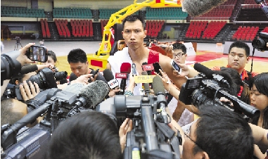 6月11日,中国队球员易建联(中)接受媒体采访。当日,中国男子篮球队在天津体育馆进行公开训练,备战将于12日的中澳篮球挑战赛第三场比赛。 新华社发