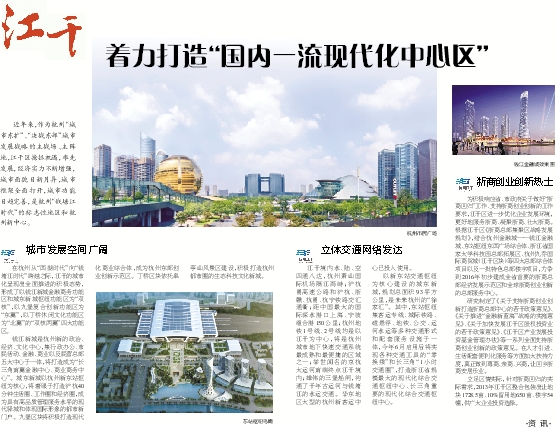 在杭州从“西湖时代”向“钱塘江时代”跨越之际,江干的城市化呈现出全面推进的积极态势,形成了以钱江新城金融商务功能区和城东新城枢纽功能区为“双核”,以九堡复合创新功能区为“东翼”,以丁桥休闲文化功能区为“北翼”的“双核两翼”四大功能区。