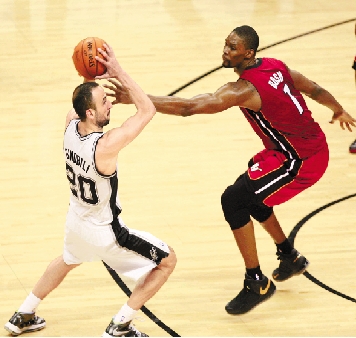 6月11日,热火队球员波什(右)在比赛中防守马刺队球员吉诺比利。 新华社发
