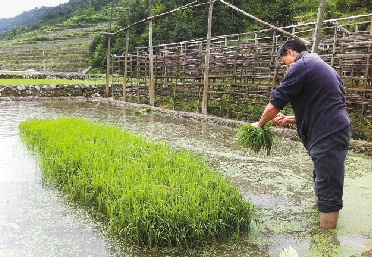 便民服务队队员刘兰福帮村民拔秧苗。 夏丹 摄
