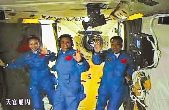 6月13日拍摄的北京航天飞行控制中心大屏幕显示:3名航天员在天宫一号向地面科研人员挥手致意。 新华社记者 刘潺 摄