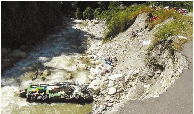 6月19日,在秘鲁塔尔玛,一辆巴士坠崖后落入塔尔玛河中。当日,一辆长途大客车在从首都利马驶往胡宁省的萨迪波城途中突然失控,坠入了百米深的山涧。车上共有54名乘客,目前警方及消防队救援人员已找到18具尸体,并救出15名伤势严重的乘客,其余人员仍然失踪,警方估计死亡人数将超过30人。 新华社发 |