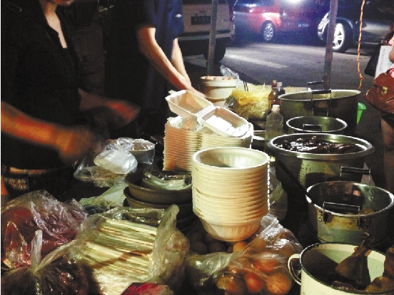 夜宵摊上,发泡塑料餐具的身影一直存在。 陆遥 摄