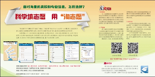“淘志愿”APP(直接扫下面的二维码)、“淘志愿”网站(http//:zysj.8531.cn)是《浙江日报》携手浙江省高考志愿填报专家为浙江高考学生独家开发的“浙江省高考志愿智能设计系统”。