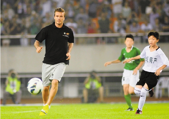 ③6月22日,中超杭州绿城对北京国安的比赛在杭州黄龙体育中心举行,绿城以2比1胜北京国安。贝克汉姆到场观战,并带小球员上场踢球。