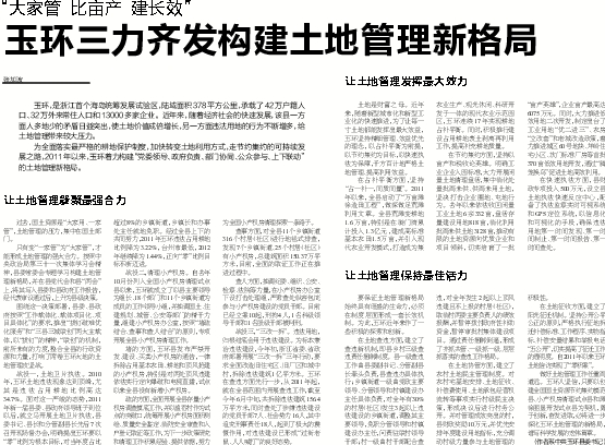 为全面落实最严格的耕地保护制度,加快转变土地利用方式,走节约集约的可持续发展之路,2011年以来,玉环着力构建“党委领导、政府负责、部门协同、公众参与、上下联动”的土地管理新格局。