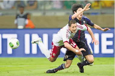 6月22日,墨西哥队球员哈·埃尔南德斯(左)与日本队球员拼抢。 新华社发