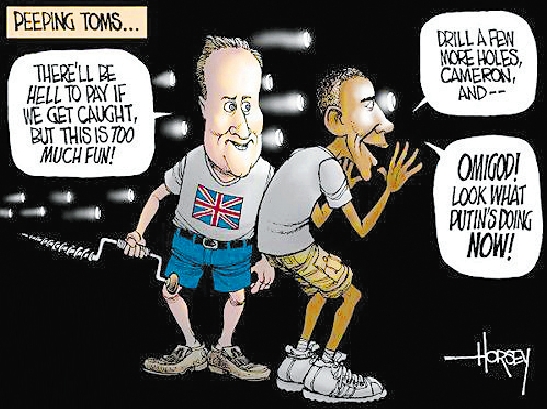 图右的美国总统奥巴马说:“卡梅伦,再钻几个洞……天哪!看看普京正在做什么!”旁边的英国首相卡梅伦说:“如果我们被发现,那麻烦就大了。不过这太好玩了!”图左上方的英文意为“偷窥者”。近日英国被指曾对2009年赴伦敦参加二十国集团峰会的外国政要的电话进行了监听。 (原载美国报刊漫画家协会网站) |