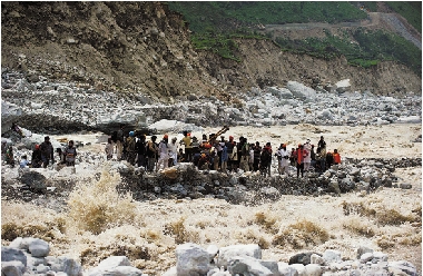6月23日,在印度北阿肯德邦的戈温德卡德,被洪水围困的人群等待救援。印度北阿肯德邦灾难管理部长亚什帕尔·雅利安23日晚说,该邦连日遭到暴雨引发的洪水及泥石流冲击,造成的死亡人数可能超过5000人。近日,强降雨袭击了印度北部的北阿肯德邦、北方邦和喜马偕尔邦等地区,降水量远远高出往年平均水平,造成洪水及泥石流等次生灾害。 新华社发 |