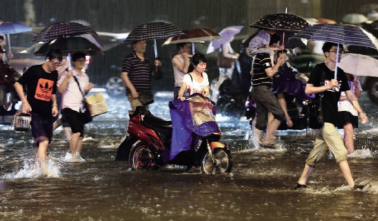 昨晚,杭城突降倾盆大雨,城北一片汪洋,市民在莫干山路上涉水而行。
