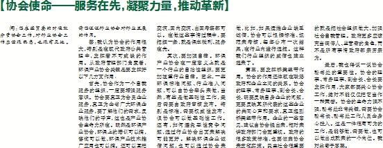 第三,要发挥桥梁纽带作用。协会的作用还体现在联络政府和企业之间的关系。协会的理事、常务理事、副会长、会长,既要反映自身企业的问题,更要反映其所代表的这些企业的共同心声和要求,真正起到桥梁纽带作用。企业的一些意见、建议由协会提出来,相对来讲政府部门会更重视。政府的很多政策标准,也要依靠协会来贯彻实施。民主社会很重要的就是把社会组织做大,加强社会自我管理。政府更多应该充当调停人、监管者的角色,而不是所有事情政府都亲历亲为。