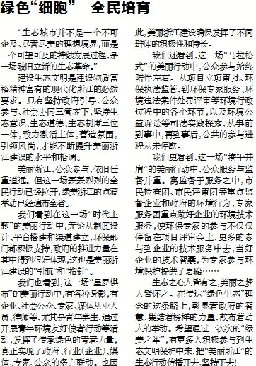 我们看到在这一场“时代主题”的美丽行动中,无论从制度设计、平台搭建和渠道建立,环保部门都积极支持,政府的推进力量在其中得到很好体现,这也是美丽浙江建设的“引航”和“指针”。