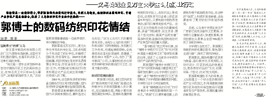 郭振荣是一位海归博士,带着国际领先的数码打印技术,来到义乌创业,他把纺织品数码印花、市场产品和客户需求相结合,促进了义乌纺织印花行业的升级换代——