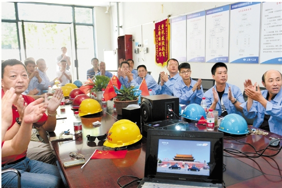 9月3日,长兴张家村花园保障房项目部,项目参建方工人代表聚在会议室,收看阅兵式直播。 谭云俸 李轩 摄
