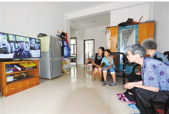 9月3日,磐安县全国道德模范陈斌强的家人在观看大阅兵。陈斌强应邀到北京参加大阅兵观礼活动。 孔德宾 摄