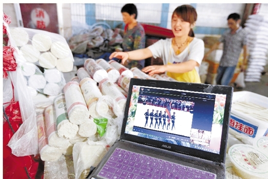 嘉兴市菜市场个体户观看大阅兵电视直播。 储永志 摄