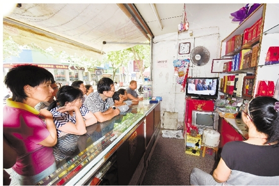 磐安县一小店内,众人收看大阅兵直播。 孔德宾 摄