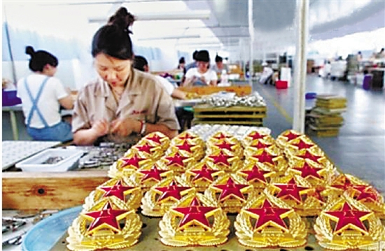 苍南县金乡徽章厂为仪仗队和军乐团生产帽徽、领花等。