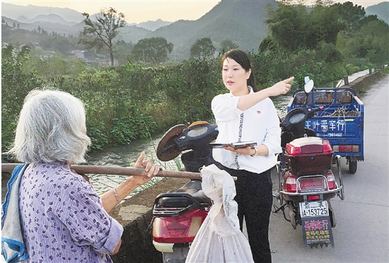 莲都区丽新畲族乡干部蓝棋议骑着电动自行车,到畎岸村宣传农医保政策。 褚敏 吴立库 摄