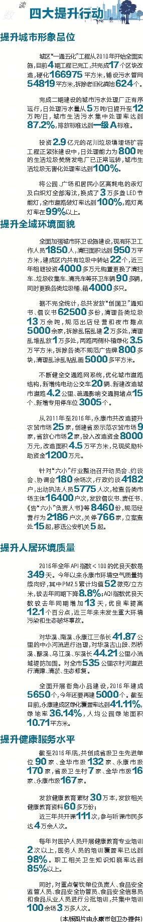 全面开展街角小品建设,2016年建成5650个,今年还要再建5000个。截至目前,永康建成区绿化覆盖率达到41.11%,绿地率36.14%,人均公园绿地面积10.71平方米。