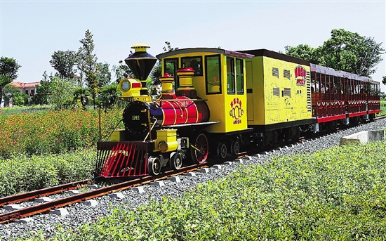 嘉善巧克力小镇,一列观光小火车在花海中穿行。