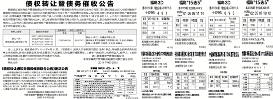 根据浙江省浙商资产管理有限公司与中国华融资产管理股份有限公司浙江省分公司签订的《债权转让协议》,中国华融资产管理股份有限公司浙江省分公司所合法拥有的本公告项下资产(包括债权及担保从权利)依法转让给浙江省浙商资产管理有限公司,中国华融资产管理股份有限公司浙江省分公司特公告通知各债务人及担保人(或义务承担人),从公告之日起向浙江省浙商资产管理有限公司履行相关义务。浙江省浙商资产管理有限公司作为上述资产的受让人,现公告要求债务人及担保人或义务承担人,从公告之日起向浙江省浙商资产管理有限公司履行主债权合同及担保合同约定的偿付义务或相应的担保责任或法院判决文书所确定的义务。