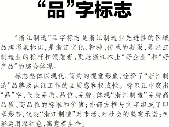 “浙江制造”品字标志是浙江制造业先进性的区域品牌形象标识,是浙江文化、精神、传承的凝聚,是浙江制造业的标杆和领跑者,更是浙江本土“好企业”和“好产品”的综合体现。