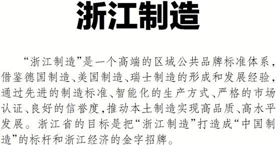 “浙江制造”是一个高端的区域公共品牌标准体系,借鉴德国制造、美国制造、瑞士制造的形成和发展经验,通过先进的制造标准、智能化的生产方式、严格的市场认证、良好的信誉度,推动本土制造实现高品质、高水平发展。浙江省的目标是把“浙江制造”打造成“中国制造”的标杆和浙江经济的金字招牌。