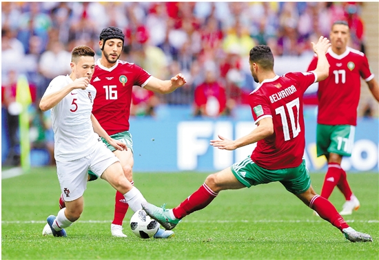 6月20日,葡萄牙队球员格雷罗(左一)与摩洛哥队球员贝尔汉达(右二)拼抢。当日,世界杯足球赛B组小组赛中,葡萄牙队击败摩洛哥队。 新华社发
