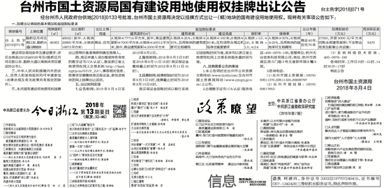台州市国土资源局国有建设用地使用权挂牌出让公告 台土告字[2018]071号