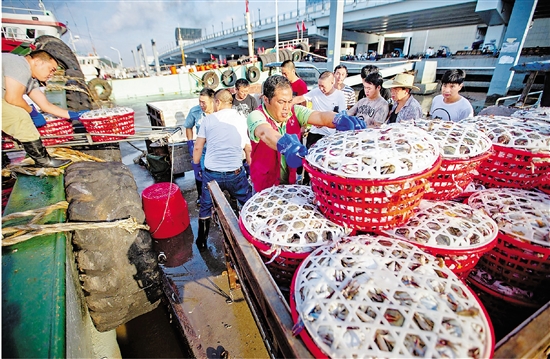 | 8月4日,伏季休渔后开捕的第一网梭子蟹运抵舟山国际水产城码头,一艘艘满载螃蟹的渔运船陆续靠岸,工人正将一筐筐螃蟹装车。当天凌晨至中午,码头共有25艘活鲜船靠岸投售,累计交易梭子蟹25万公斤。 本报记者 余若望 摄 |