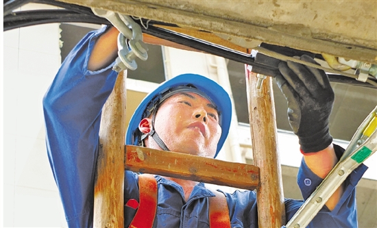 电力工人在安装集束电缆落户线 褚津津 摄