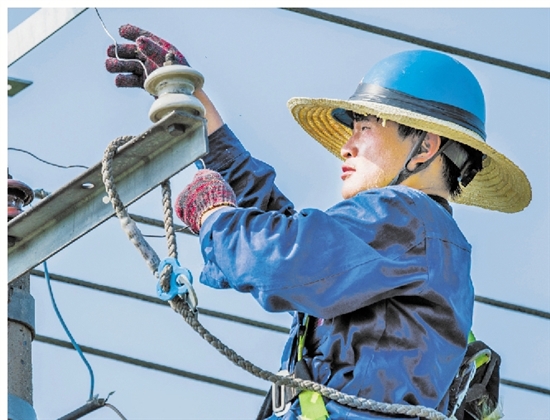电力工人对台区内线路进行升级改造 陆勇 摄
