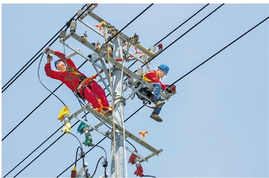 电力工人冒高温开展线路改造工作 潘志强 摄