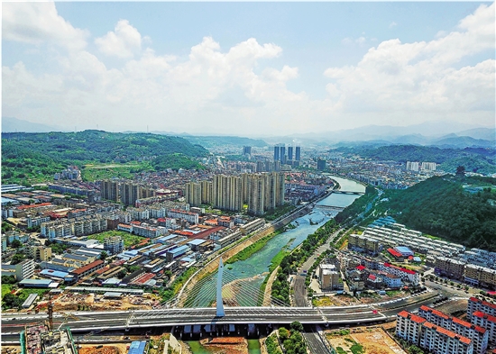 2018年8月22日,鸟瞰新昌县城,穿城而过的新昌江上已架起十几座大桥,最前面的天姥大桥将于今年9月底通车。