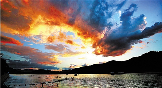 8月29日,杭城持续高温,傍晚西湖上空现火烧云,染红了半边天。摄影爱好者为天边“那团火”着迷,杭州人的微信朋友圈也被蓝天“大片”霸了屏。 拍友 王荣贵 摄