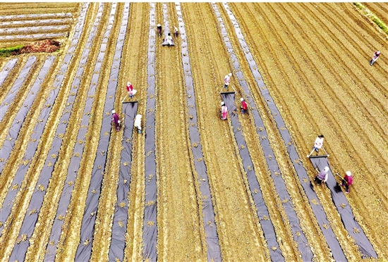 2月20日,在贵州省黔东南苗族侗族自治州榕江县忠诚镇安乐村,村民在田间覆盖地膜。