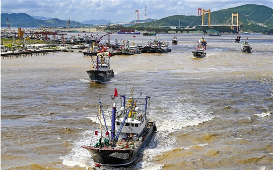 8月1日,随着伏季休渔期第一批渔船“解禁”,在岱山海域停泊了3个月的数百艘渔船陆续离港,驶向各自作业海域,场面蔚为壮观。据悉,此次全省“解禁”渔船共1万余艘。 本报记者 李震宇 李翔 摄