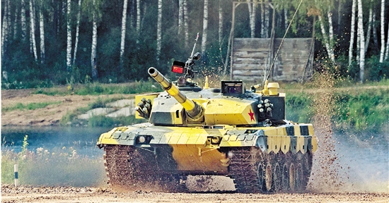 8月3日,“国际军事比赛—2019”的揭幕赛——一场“坦克两项”小组赛在俄罗斯首都莫斯科远郊的“阿拉比诺”靶场举行。中国“坦克两项”参赛队在小组赛中夺得第一名。图为中国队96B型坦克在比赛中。