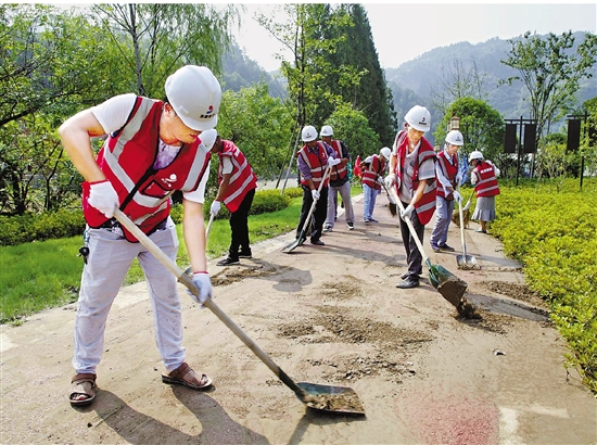 近日,浙江省建设投资集团股份有限公司专门组织近百名志愿者来到新昌镜岭镇,帮助该镇灾后清洁家园。 拍友 俞晓委 摄