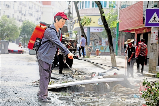 日前,温岭市大溪镇继续开展积水区清理消杀工作。