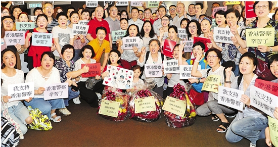 8月16日,香港市民在香港北角警署大楼表达支持警察的心声。当日,网上自发组织的香港市民,携带慰问品,来到香港北角警署慰问,表达支持警察的心声。 新华社记者 吴晓初 摄