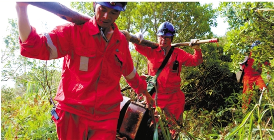 8月13日,驰援温州乐清的国网衢州供电公司抢修队在大荆镇大沙溪村抢险 黄俊 摄