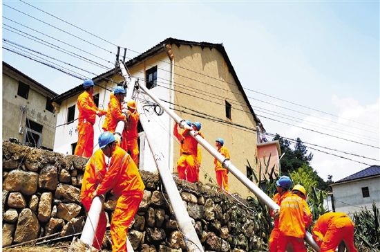 抢修队伍正在恢复倾斜电杆 朱俊杰 摄